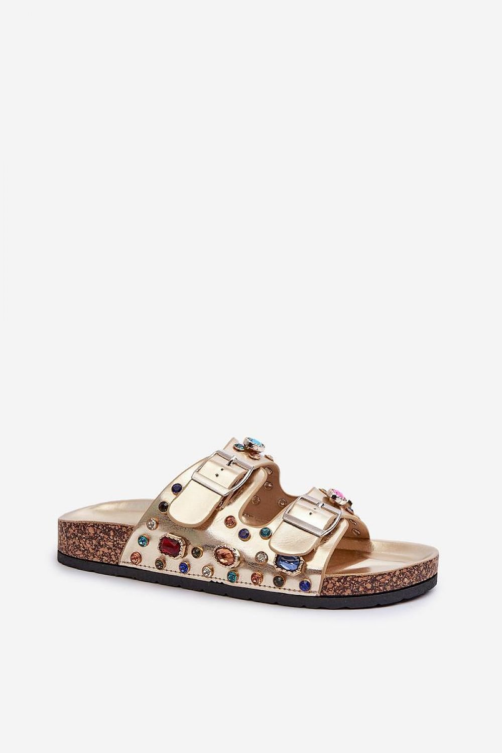 S.Barski brand flip flops made of eco leather. Decorated with sparkling crystals, they add glamour to every outfit. Set on a cork platform, they provide stability and a trendy look. At the front, there are two adjustable straps with buckles, ensuring a perfect fit. This footwear not only catches the eye with its unique design but also provides comfort while wearing.