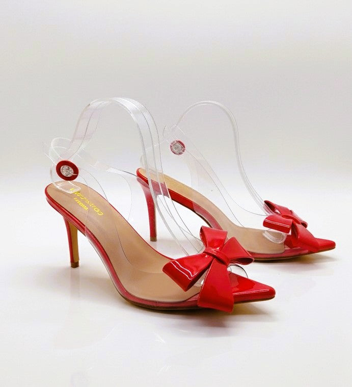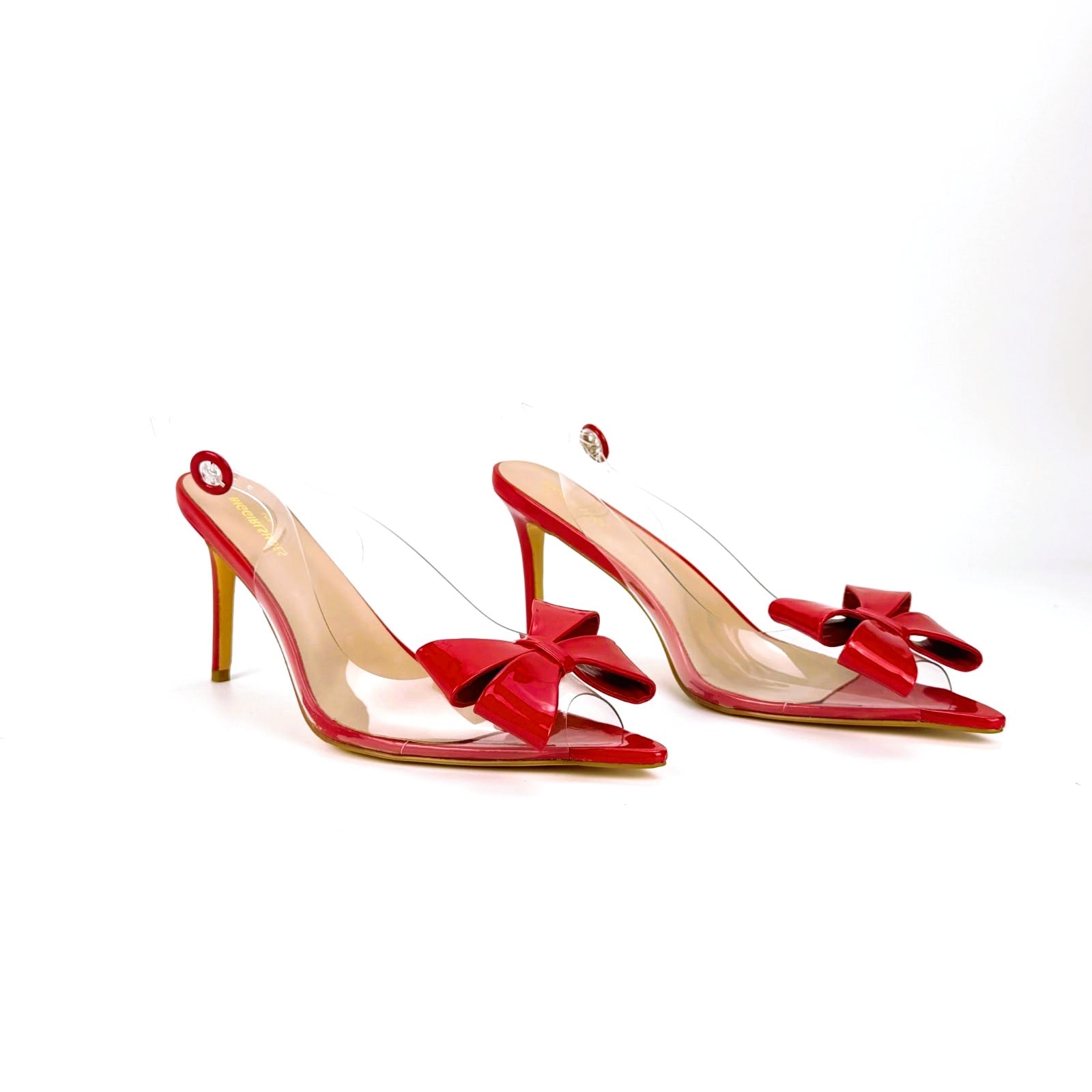 Made from premium patent faux leather, the upper features a beautifully sculpted bold red bow that adds a standout detail to the classic pointed-toe silhouette. The transparent PVC slingback strap offers a modern, barely-there illusion while providing secure support. The strap is completed with a red-toned adjustable clasp, allowing for a customised fit around the heel.